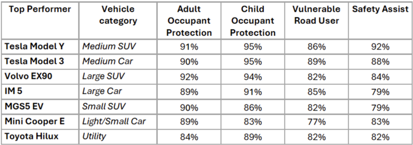 “The top performers delivered consistent results across physical crash protection, crash avoidance and vulnerable road-user safety, rather than relying on strength in a single area.