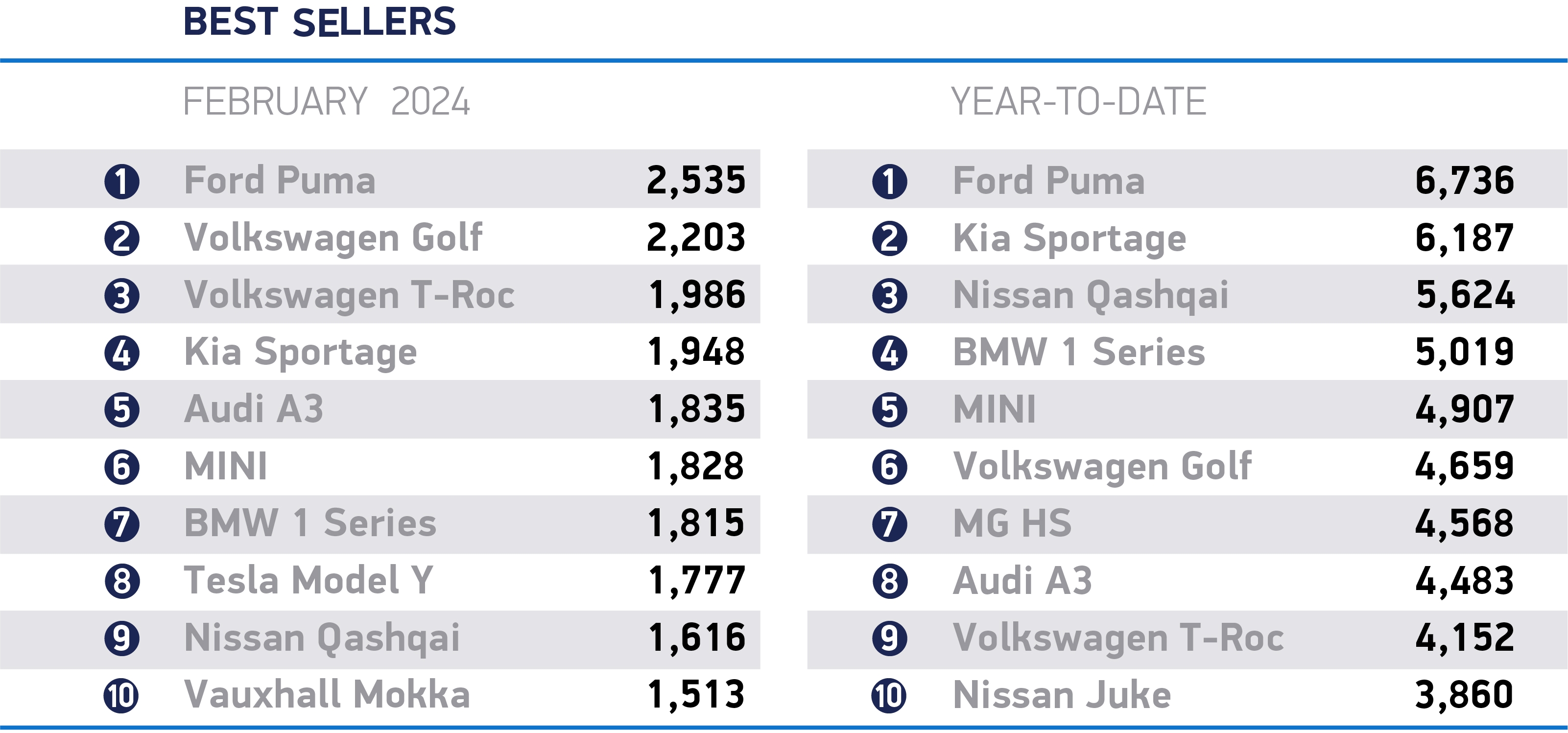 Ford’s Puma, pictured, was the top model in February with 2,535 registrations and also leads the year-to-date chart on 6,736 units.