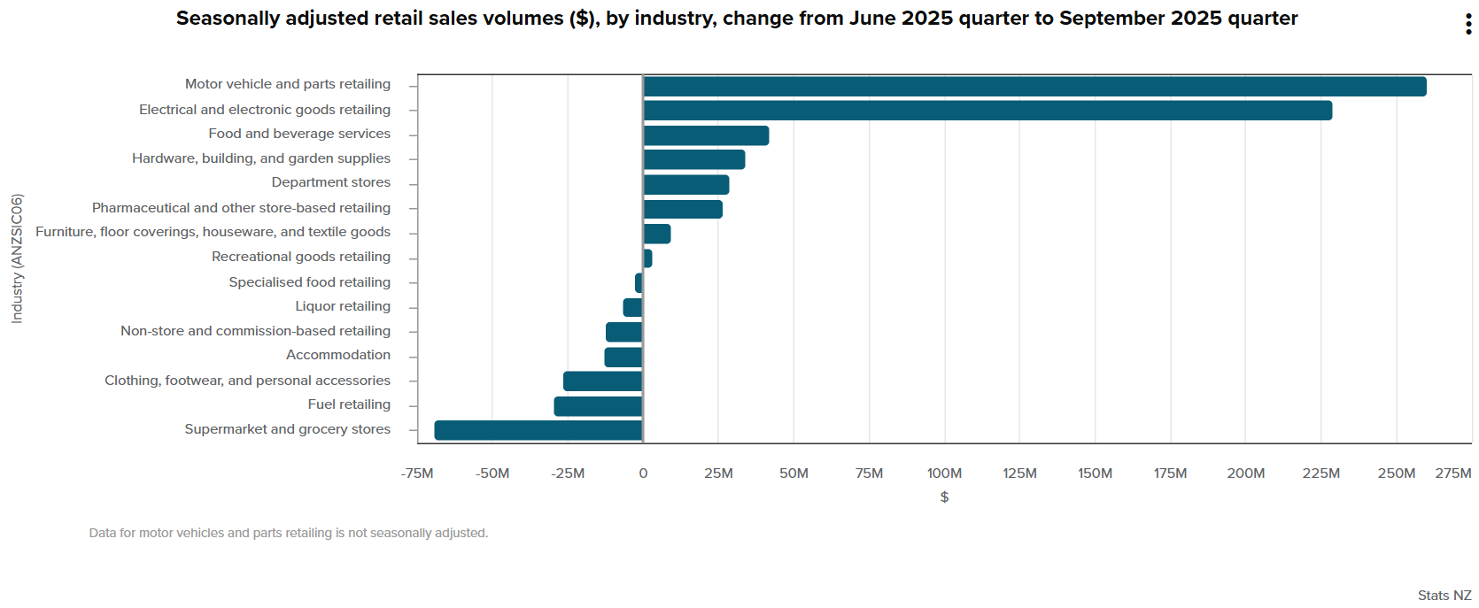 Stats NZ reports automotive and parts retailing by volume rose by 7.2 per cent or $260 million to $3.88 billion in the September quarter.