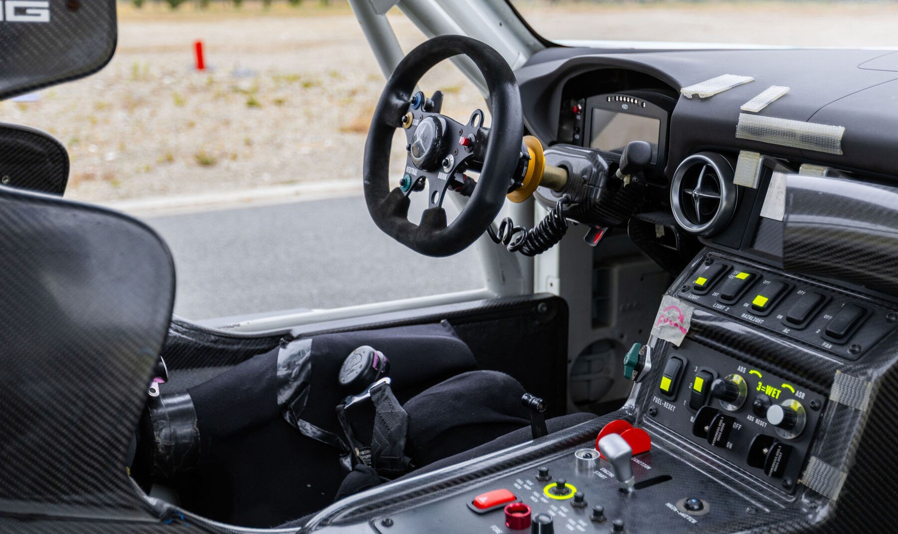 The interior boasts a carbon race seat, FIA-specification safety gear, a digital dash and a quick-release wheel.