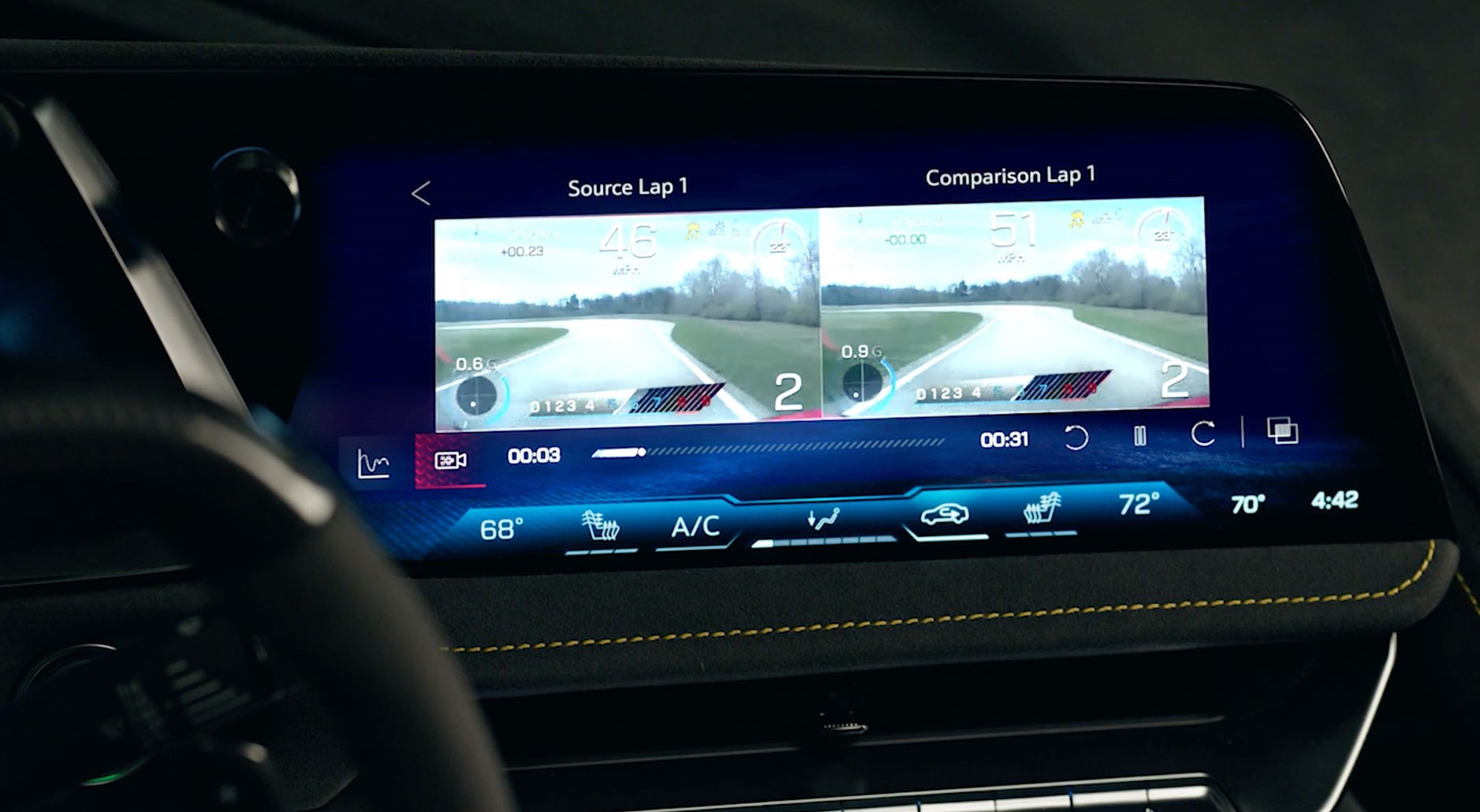 Technology outside the cabin has been updated with the enhanced performance data recorder undergoing a user-interface overhaul with features such as side-by-side video analysis and “speed tips” coaching delivering real-time insights from the vehicle screen. The performance app, previously exclusive to E-Ray but now across all Corvettes, has had further capability added.